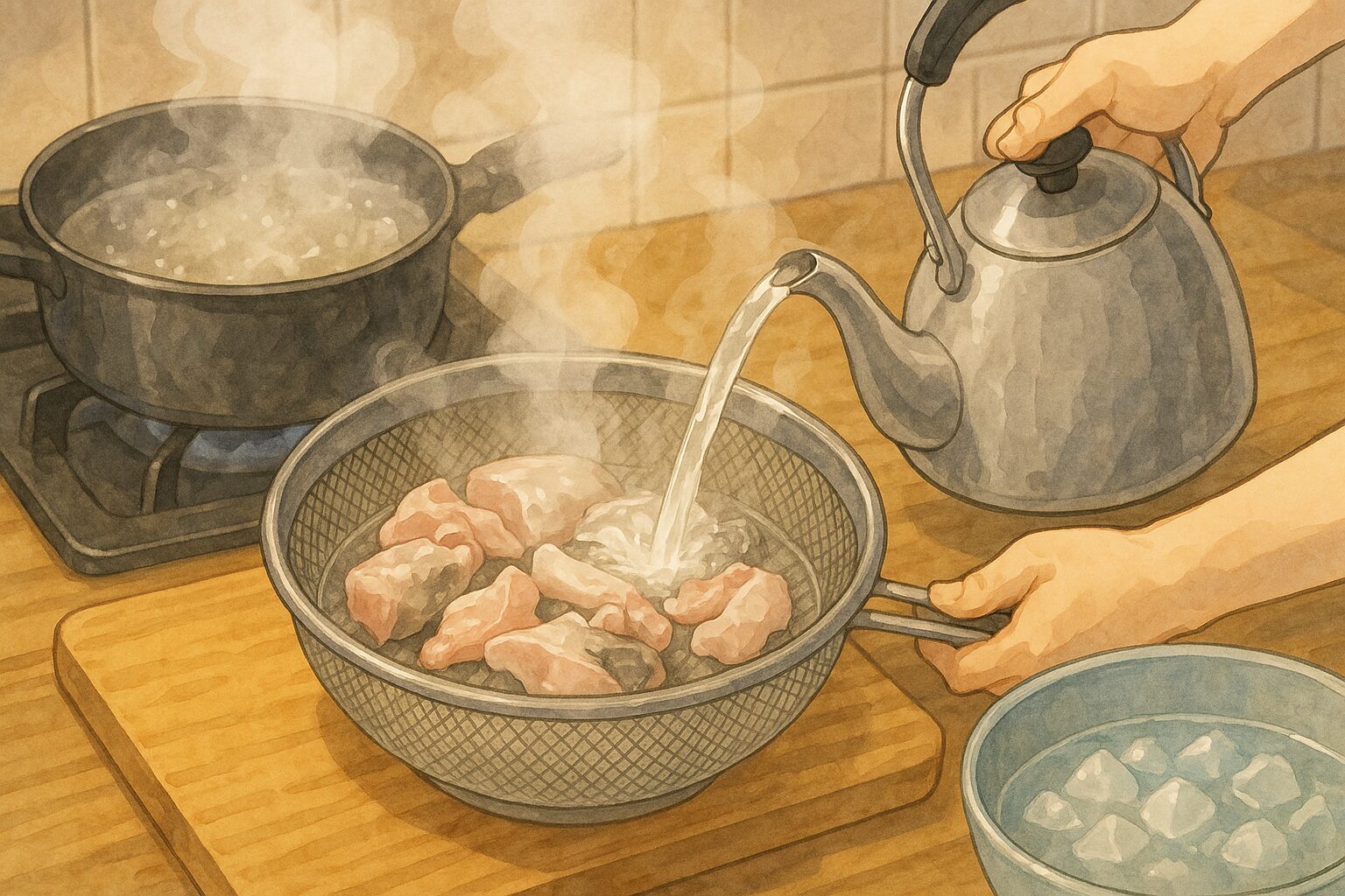 まず、「身・アラ・皮」の臭みとぬめりを取るための下処理(湯通し)です。
