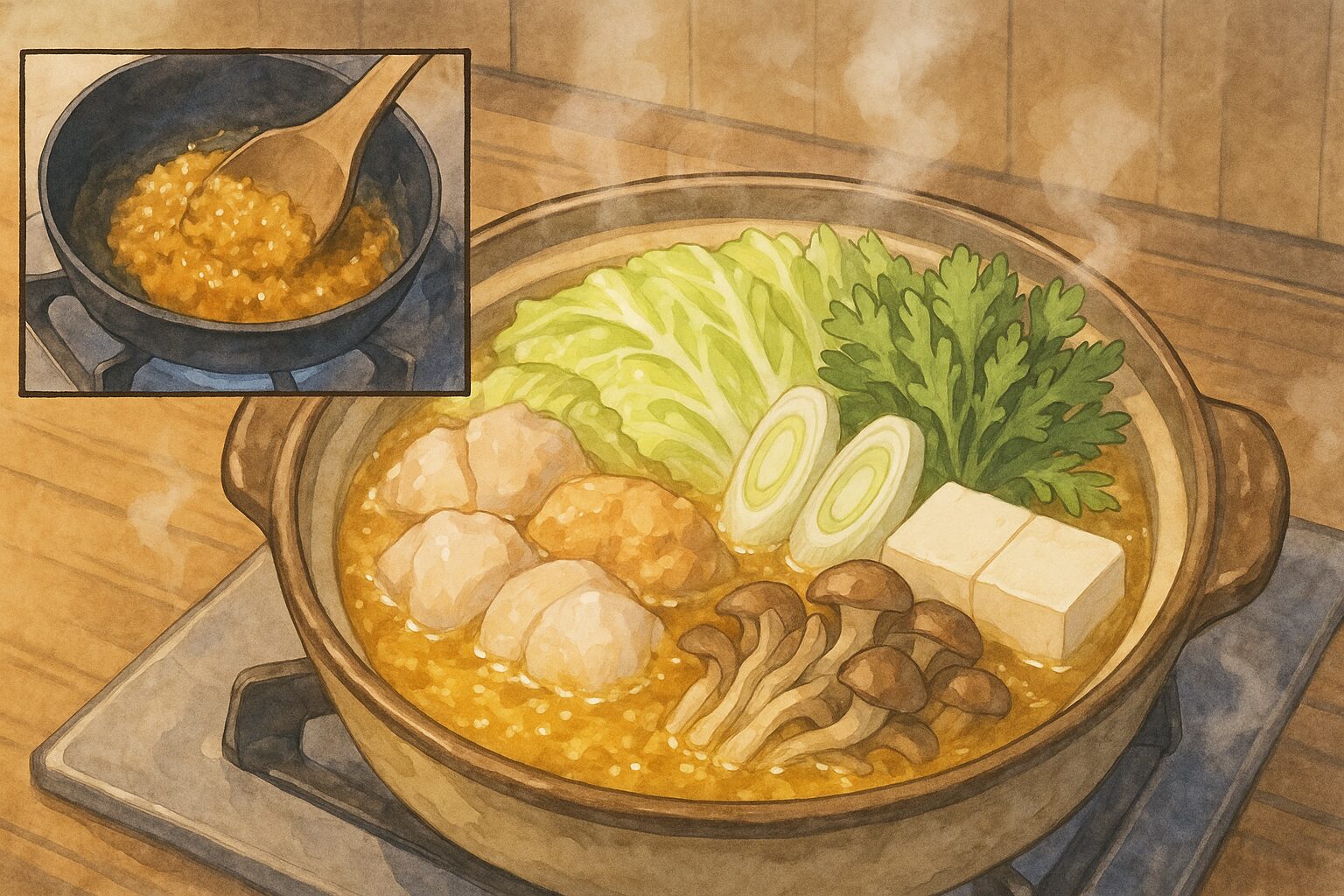 4. スープをのばす:水(または昆布だし)を少量ずつ加えながら、ペーストをスープ状にのばしていきます。全量を加えたら一度沸騰させ、濃厚な鍋ベースの完成です!