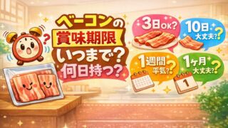 ベーコンの賞味期限切れはいつまでか、3日・10日・1週間・2週間・1ヶ月・2ヶ月など何日持つのかの考え方を整理。未開封・開封後・冷蔵・冷凍・常温放置ごとの判断目安と、食べないほうがいい異常サインを安全寄りでわかりやすく解説します。